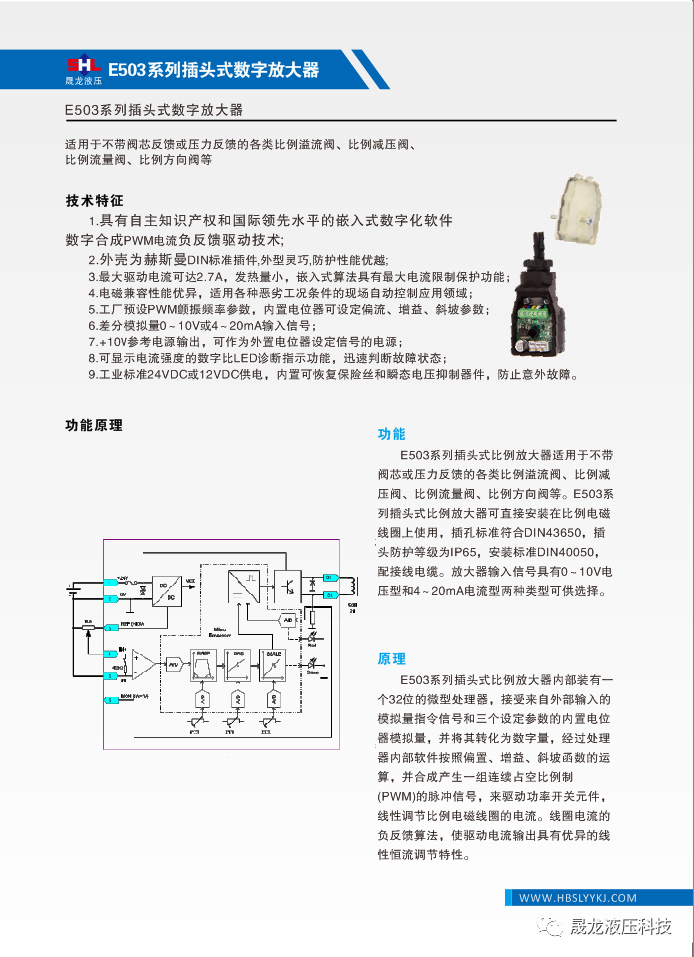 前言:适用于不带阀芯反馈或不带压力反馈的各类比例溢流阀、比例减压阀、比例流量阀、比例方向阀等。插孔标准符合DIN43650 ,插头防护等级为IP65,输入信号有0~10V、4~20mA、0~5V;