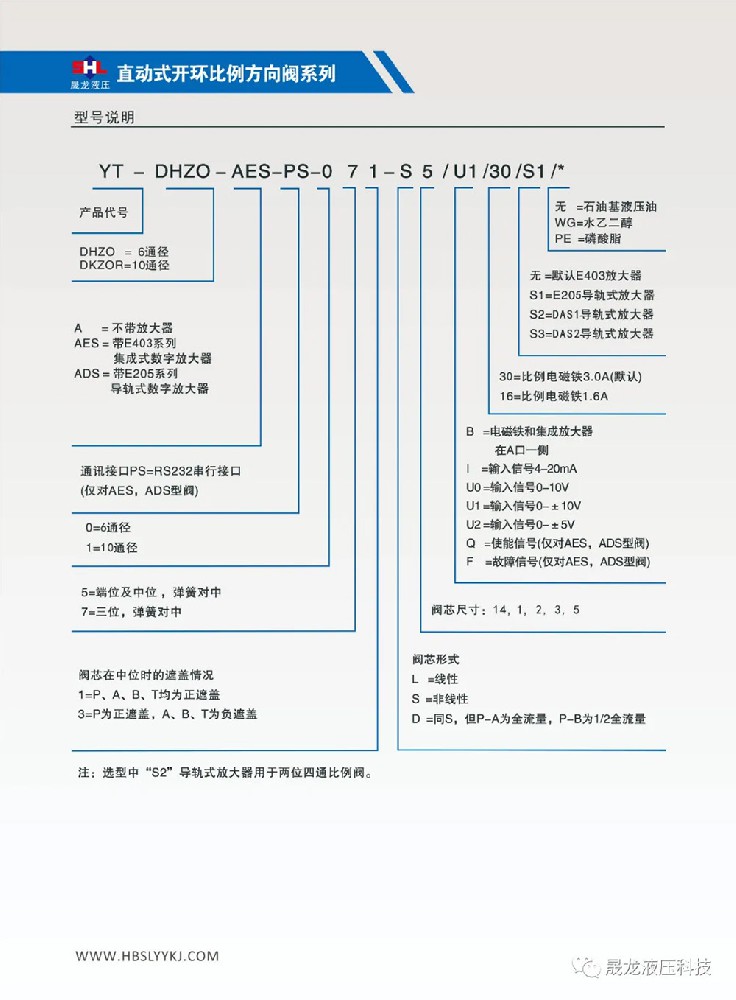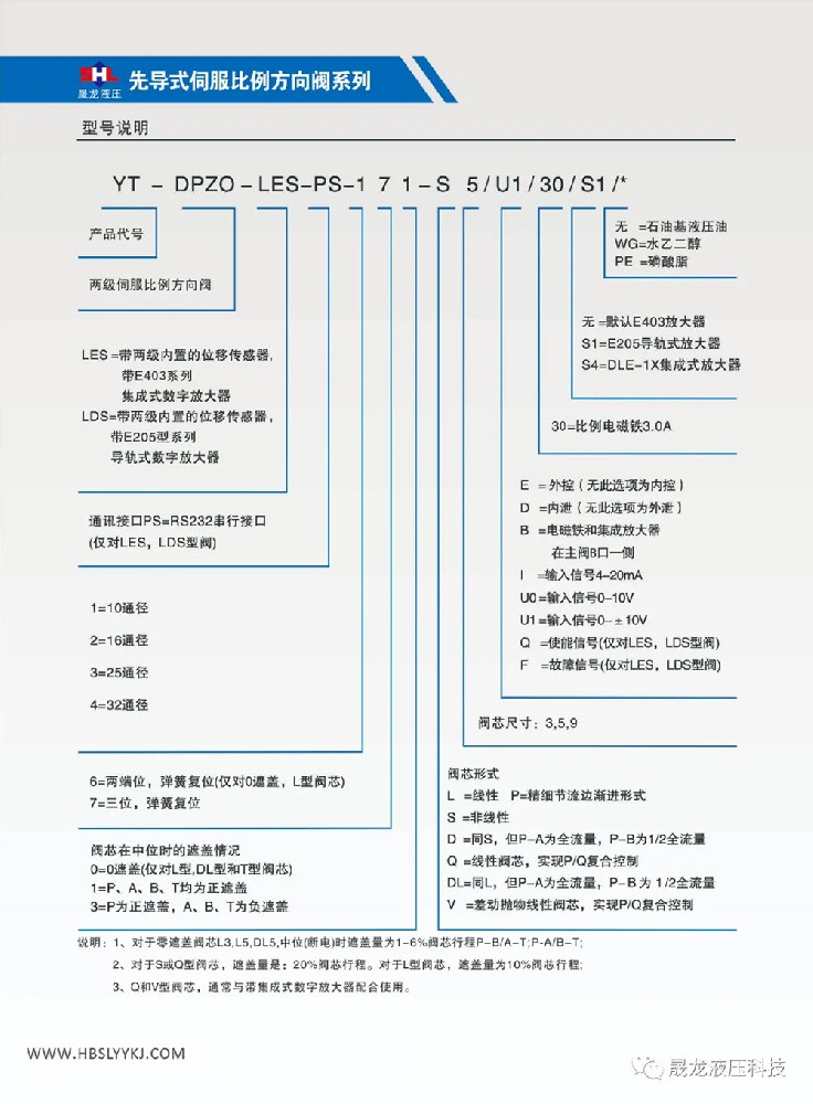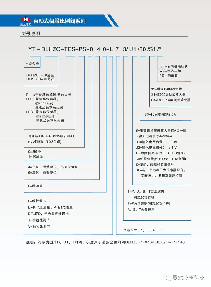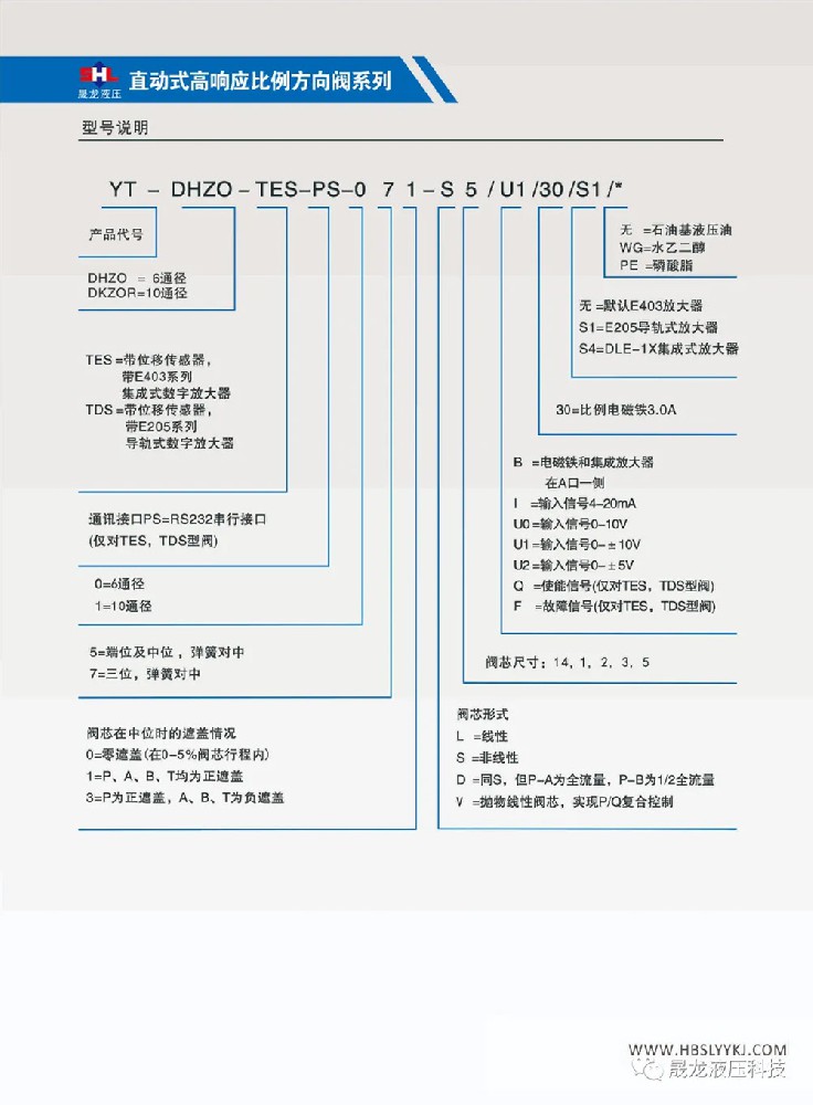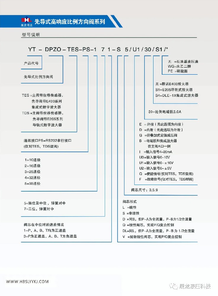 二位四通和三位四通;阀芯带位置反馈;配集成式放大器 或 导轨式放大器;规格型号:YT-DHZO-TES-…‥6通径, YT-DKZOR-TES-…‥10通径;最大工作压力:315bar;最大流量:6通径~ 55L/min, 10通径 ~100L/min;